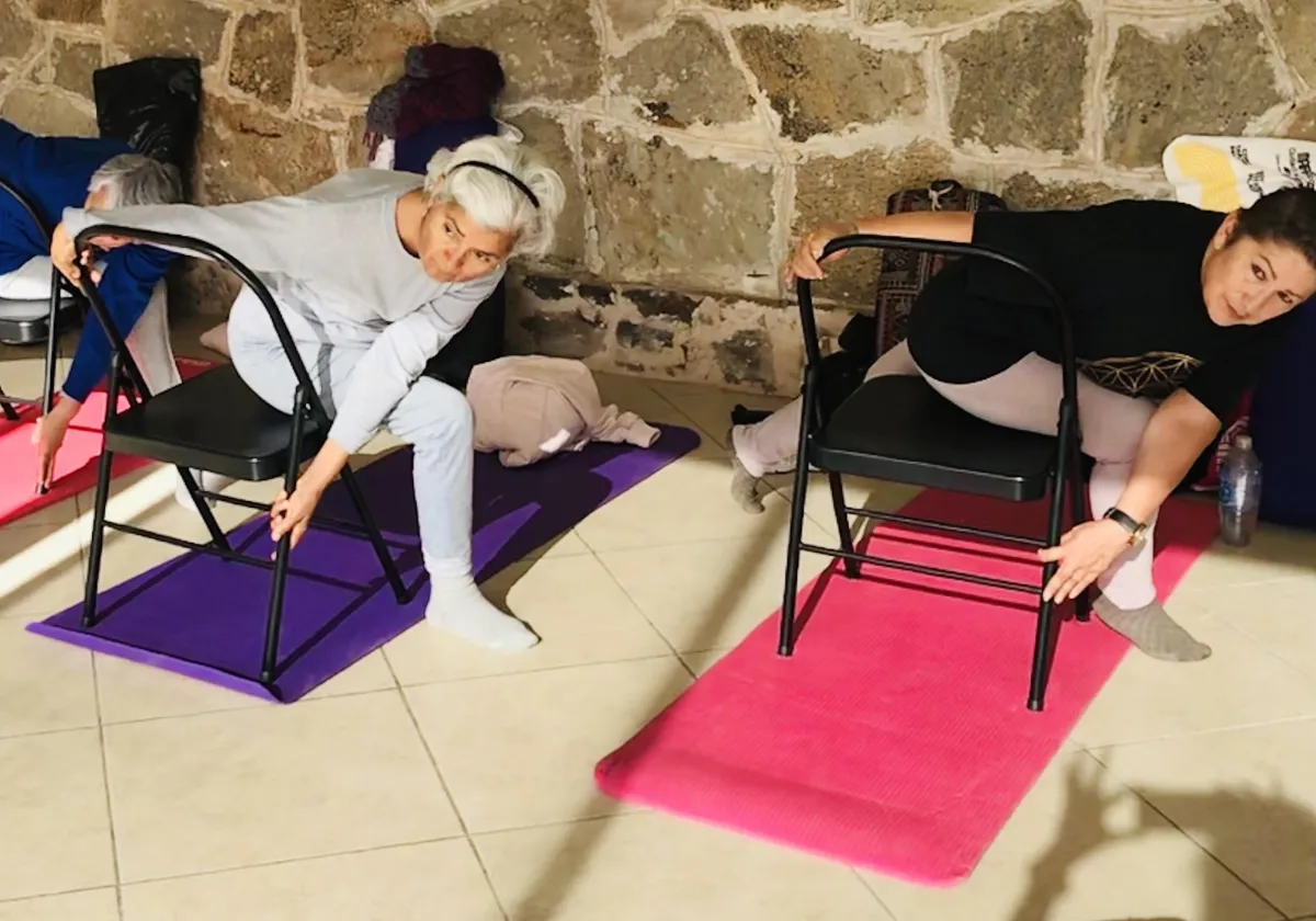 Con secuencias de yoga en silla diseñadas para mejorar la postura y el andar, reflexología, mewing y yoga para la lengua. Además de rutinas de yoga facial con masaje, acupresión, ejercicos , dinámicas y mucha risa con mujeres que buscan lo mismo que tú.